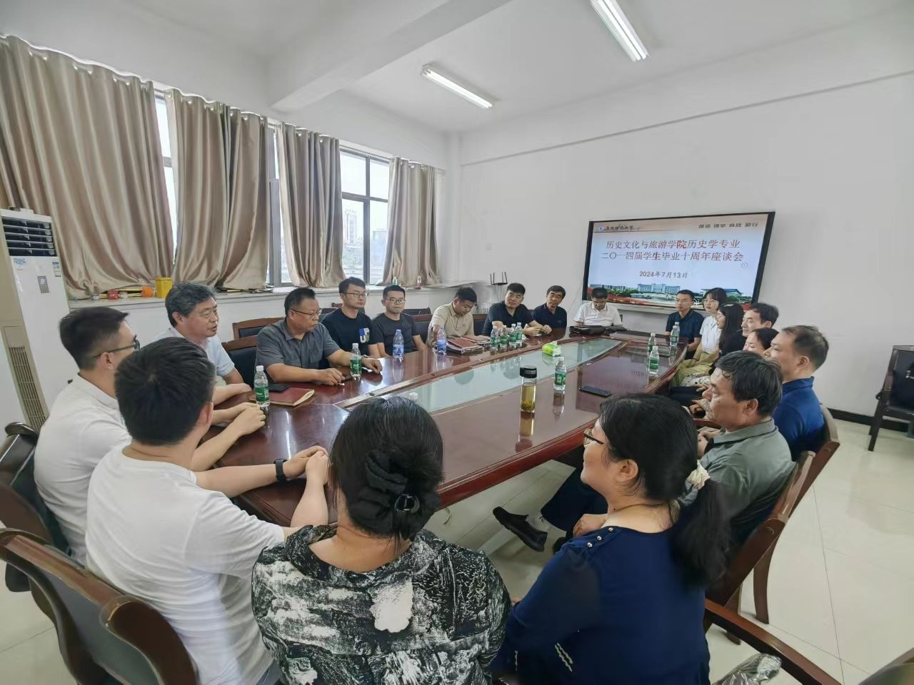 7月13日上午,学院历史学专业2014届学生毕业十周年座谈会在西湖校区汉风楼三楼会议室召开。教师代表梁家贵、李良玉、王申红、陈雷、郭从杰、洪共福、刘家富、张光全、李强等出席座谈会。梁家贵对同学们的返校表示欢迎,介绍了学院近十年来的发展情况和未来的发展规划,欢迎同学们常回家看看,多关心母校发展,多提宝贵意见。同学们回顾了在校期间的收获,分享了毕业后的工作和生活经历,他们感恩母校四年的培养,学到了安身立业的知识和为人处世的道理,他们诉说工作中的收获与迷茫。一如十年前,老师们为大家的成长而高兴,也为大家的烦恼答疑解惑、指点迷津。