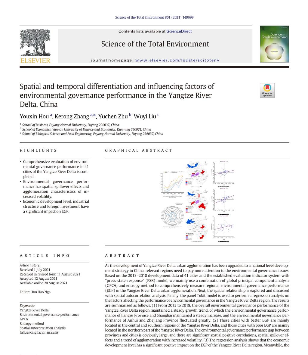 近日,中国科学院JCR分区一区环境科学与生态学领域的TOP期刊Science of the Total Environment(IF=7.963)在线发表了我校商学院张克荣教授课题组的最新研究成果“Spatial and temporal differentiation and influencing factors of environmental governance performance in the Yangtze River Delta, China”(“长三角地区环境治理绩效时空分异及影响因素研究”,原文链接:https://doi.org/10.1016/j.scitotenv.2021.149699)。该研究依托我校工商管理一级学科硕士点,通讯作者为张克荣教授,第一作者为2019级工商管理研究生侯有信,第一署名单位为阜阳师范大学。