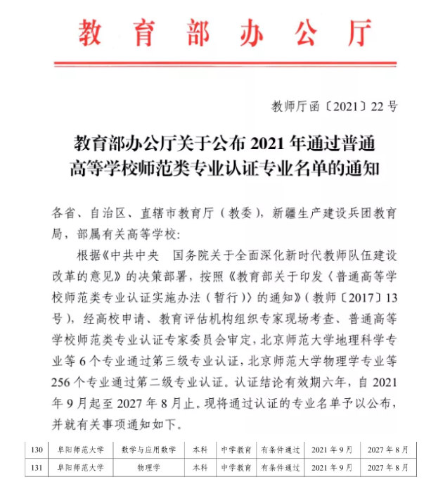 近日,教育部办公厅发布《关于公布2021年通过普通高等学校师范类专业认证专业名单的通知》,我校数学与应用数学、物理学两个专业通过师范类专业第二级认证。认证结论有效期六年。