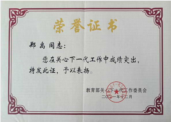 为大力弘扬“五老”精神,引导激励更多“五老”投身关心下一代工作,推动教育系统关工委工作创新发展,近日,教育部关心下一代工作委员会评选表彰了全国教育系统关心下一代工作先进集体、先进工作者和突出贡献者。我校关工委常务副主任、原校党委副书记郑禹教授被评为“全国教育系统关心下一代工作先进工作者”。