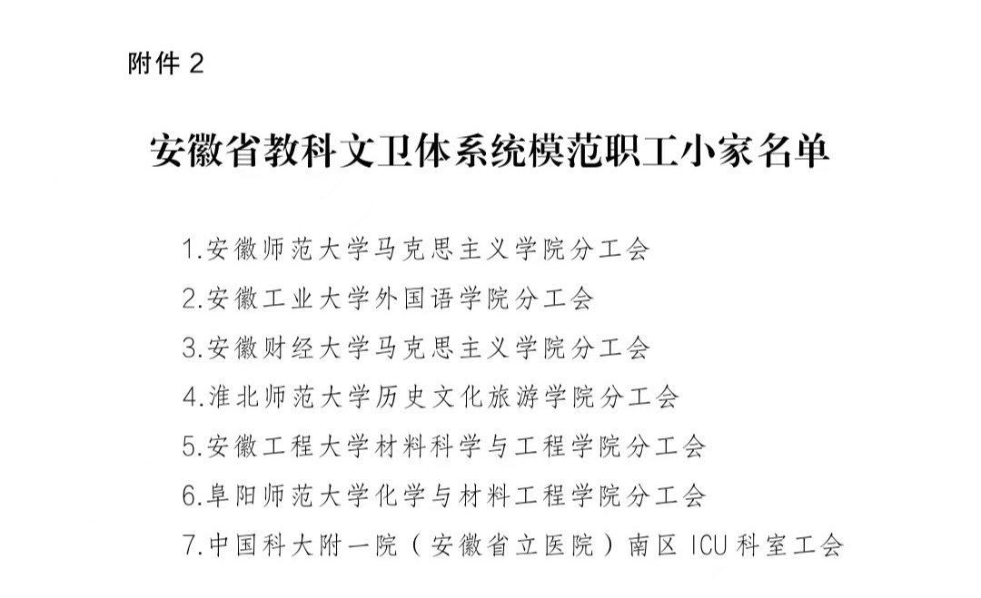 近日,安徽省教科文卫体工会公布关于命名安徽省教科文卫体系统模范职工之家、模范职工小家的决定。我校工会获安徽省教科文卫体系统“模范职工之家”荣誉称号,化学与材料工程学院分工会获得安徽省教科文卫体系统“模范职工小家”荣誉称号。