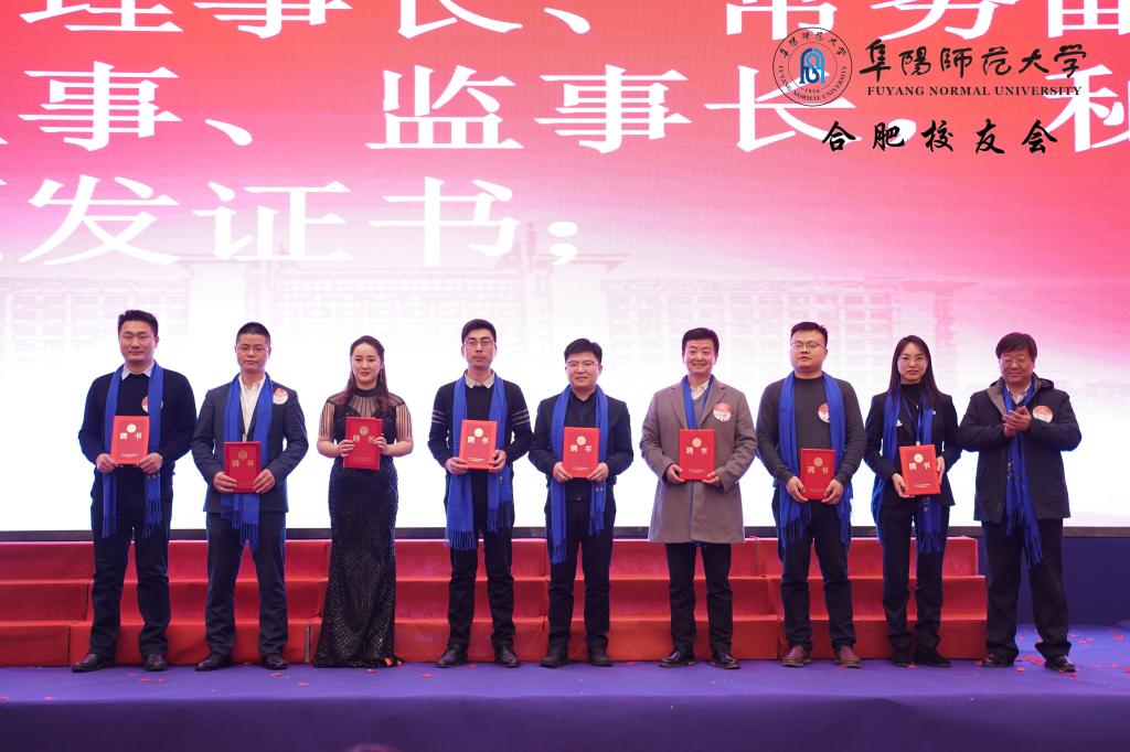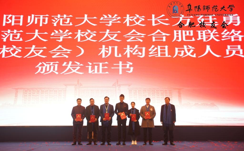 方廷勇为阜阳师范大学校友会合肥联络处机构组成人员颁发证书并合影留念。