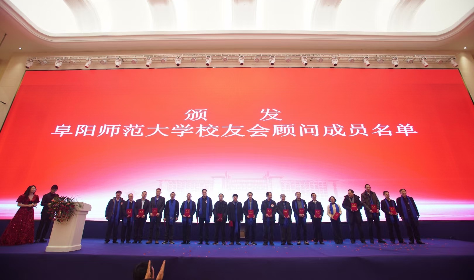 阜阳师范大学校友办主任、校友会秘书长李国强宣读了阜阳师范大学校友会顾问成员名单,程曦、方廷勇为受邀顾问颁发聘书并合影留念。
