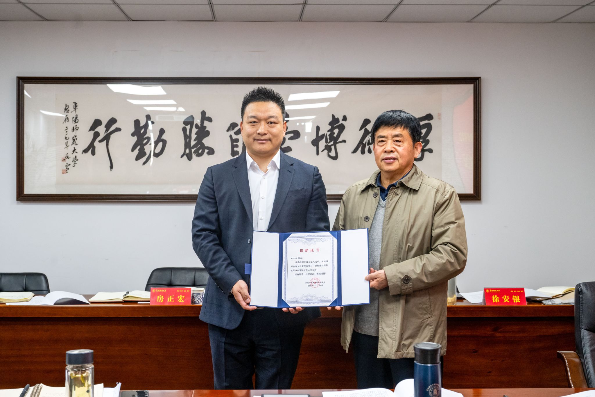 会议举行了高宝霖校友支持清河校区礼堂改造工程500万元资金的捐赠仪式,程曦与周建华分别为高宝霖校友委托代表魏长洲校友和郭强校友颁发捐赠奖牌和捐赠证书。郭强代表高宝霖校友发言,表示感恩母校的培养,上海校友会将继续践行学校校训,以实际行动回报母校,希望母校发展得越来越好。
