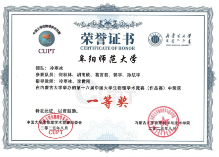 我校代表队由物理与电子工程学院物理系2023级学子何秋林、胡雨欣、葛言君、郭宇和孙航宇组成,冷寒冰和李世刚老师担任指导教师。队伍先于华东赛区赛中突破重围,成功获得全国总决赛入场券;随后在全国赛的激烈比拼中,队员们凭借扎实的物理专业功底、出色的问题解决能力与默契的团队协作,最终不负众望,荣获全国一等奖。