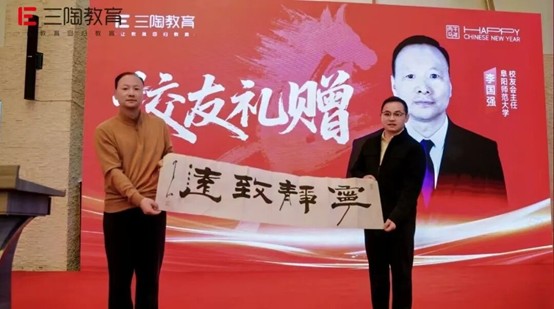 阜阳师范大学校友工作与基金事务办公室主任李国强作为校友代表向三陶教育赠送了满载情谊的珍贵礼物——题有“宁静致远”的墨宝,以此寄托双方深厚情谊与美好期许,为本次年会增添了浓厚的温情色彩。