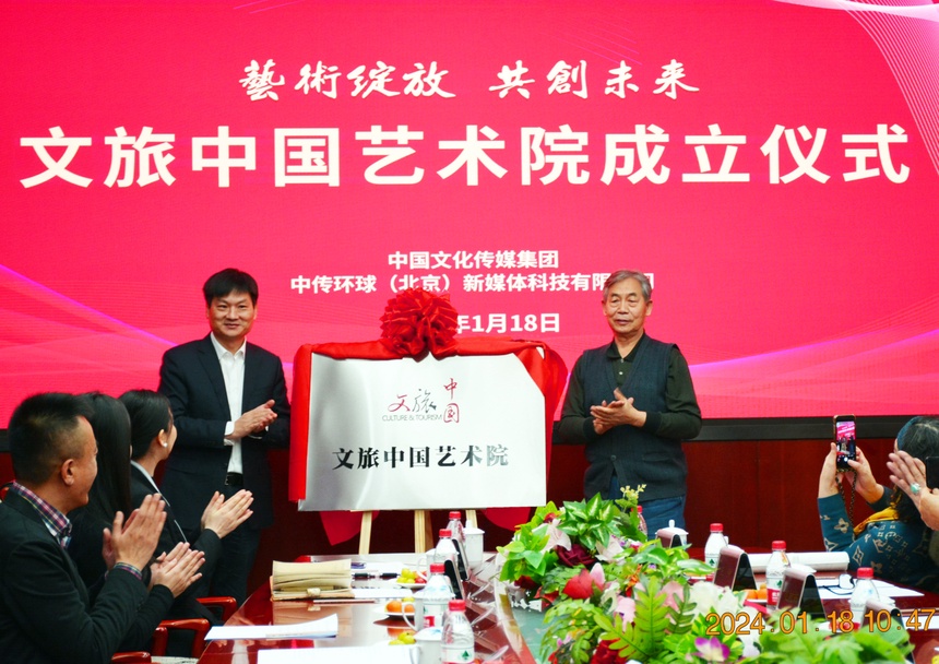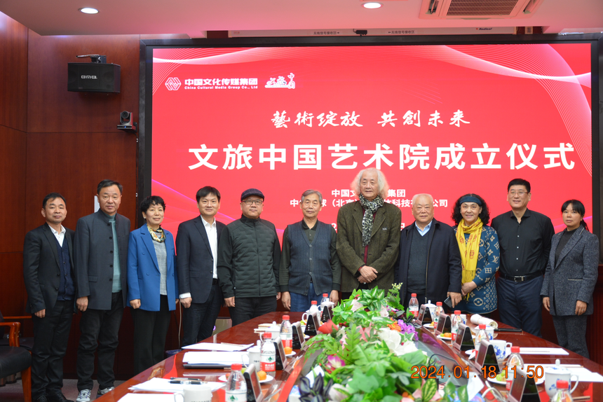 1月18日,文旅中国艺术院成立仪式在中国文化传媒集团举行。原文化部副部长常克仁,故宫博物院党委书记都海江,安徽省文投集团党委书记、董事长曹杰,中国国家画院原副院长张江舟,中国国际书画艺术研究会名誉会长赵树栋,中国美术家协会理论委员会副主任王仲,云南省玉溪市文化和旅游局副局长李美艳等出席了成立仪式。中国文化传媒集团党委书记、董事长徐海军致辞。成立仪式由中国文化传媒集团信息管理部主任,中传环球(北京)新媒体科技有限公司执行董事、总经理李霞主持。