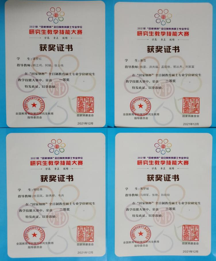 近日,全国教育专业学位研究生教育指导委员会公布“田家炳杯”全日制教育硕士专业学位研究生教学技能大赛获奖名单,我校学科教学(物理)专业2020级研究生谭罗红荣获一等奖;学科教学(历史)专业2020级研究生康雪、学科教学(生物)专业2020级研究生柳珍秀分别获二等奖;学科教学(英语)专业2020级研究生黄梦媛获三等奖。这是我校研究生首次参加全国教育硕士学科教学技能大赛并取得佳绩。
