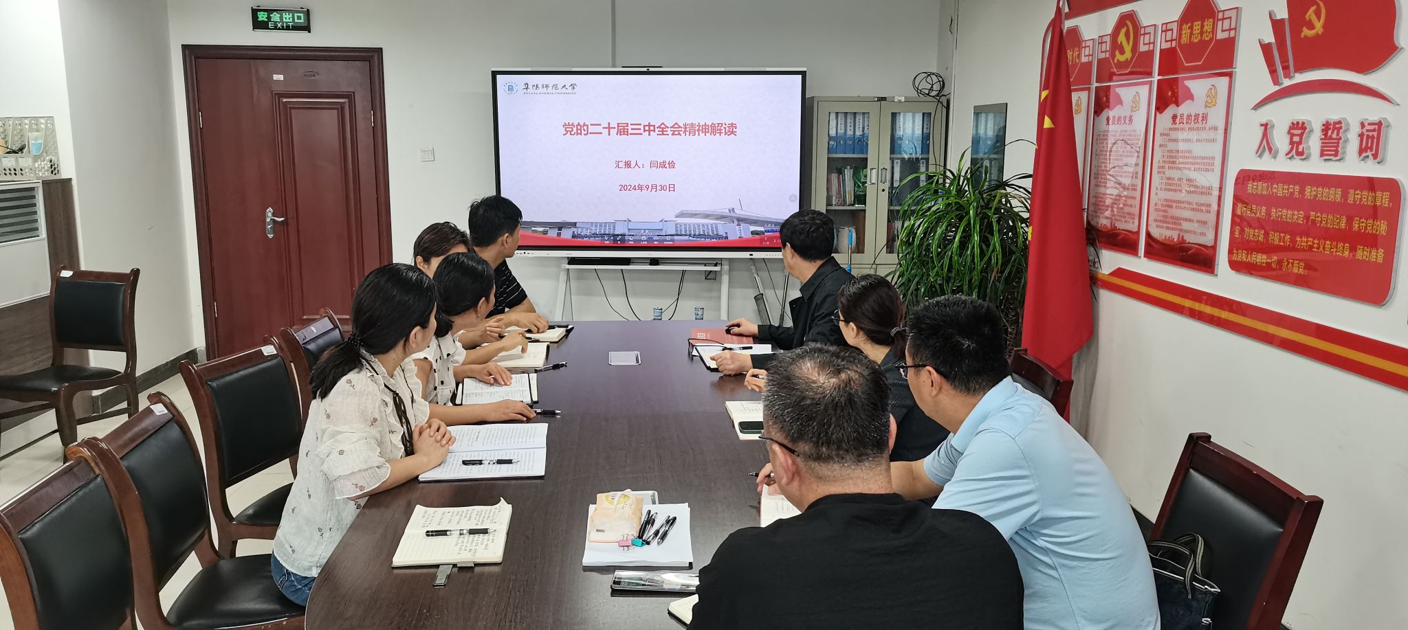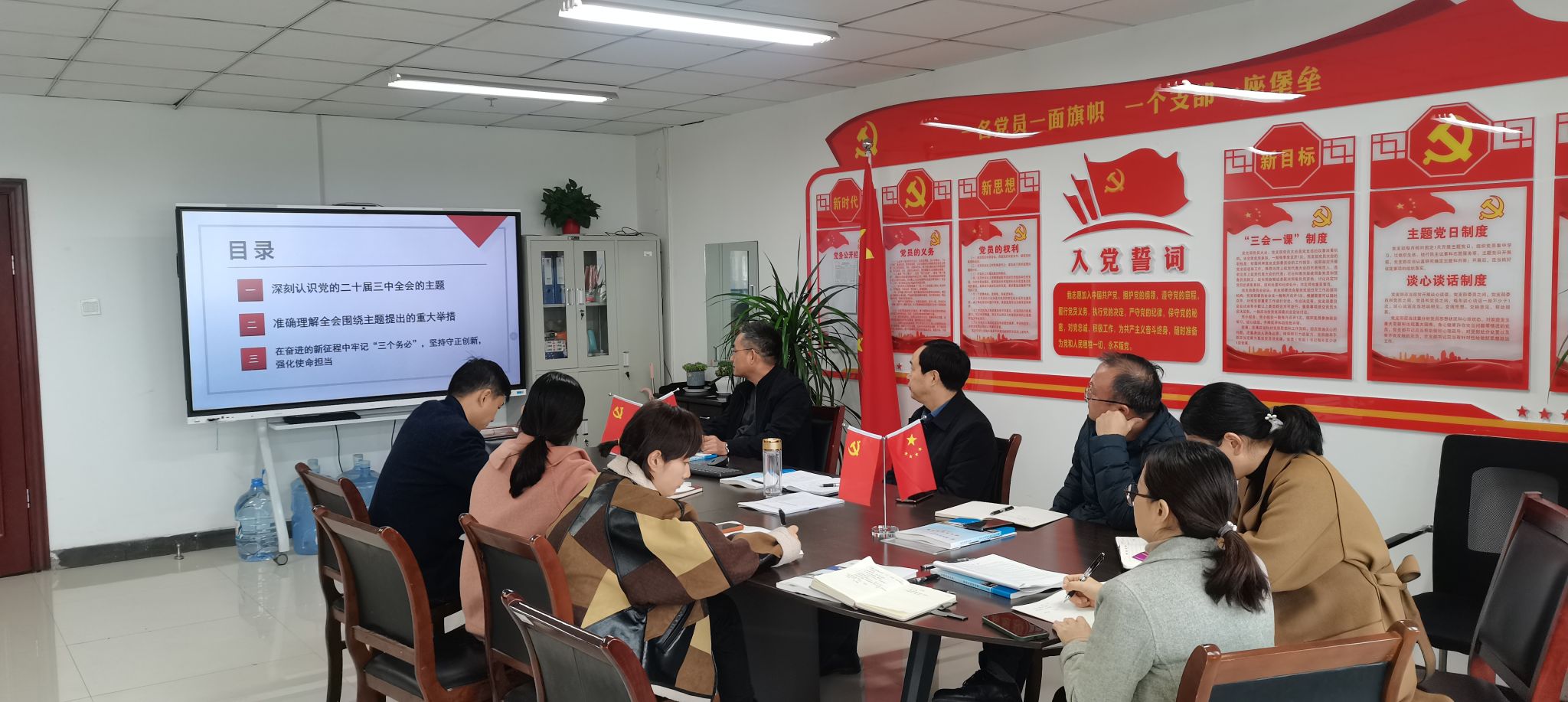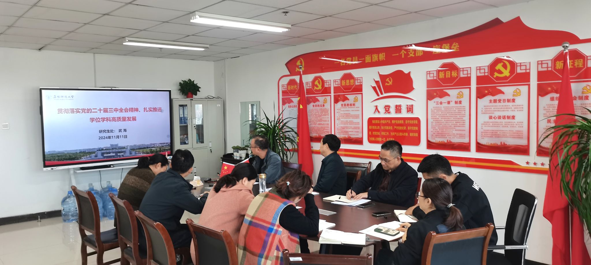 9月30日,党支部书记闫成俭以《党的二十届三中全会精神解读》为主题,详细解读了《中共中央关于进一步全面深化改革、推进中国式现代化的决定》的时代意蕴。11月11日,武海以《贯彻落实党的二十届三中全会精神、扎实推进学位学科高质量发展》为题,围绕“学习党的二十届三中全会关于教育、科技改革的重要意义”“加快推进研究生教育质量改革”“加快推进学位学科建设改革”等方面,系统概述了党的二十届三中全会对学校学位学科高质量发展的重大指导意义。11月18日,徐礼堂以《牢记“三个务必”,用党的自我革命精神引领使命与担当》为题,围绕“深刻认识党的二十届三中全会的主题”“准确理解全会围绕主题提出的重大举措”“在奋进的新征程中牢记“三个务必”,坚持守正创新,强化使命担当”等方面,重点阐释了进一步全面深化改革,推进中国式现代化的丰富内涵。