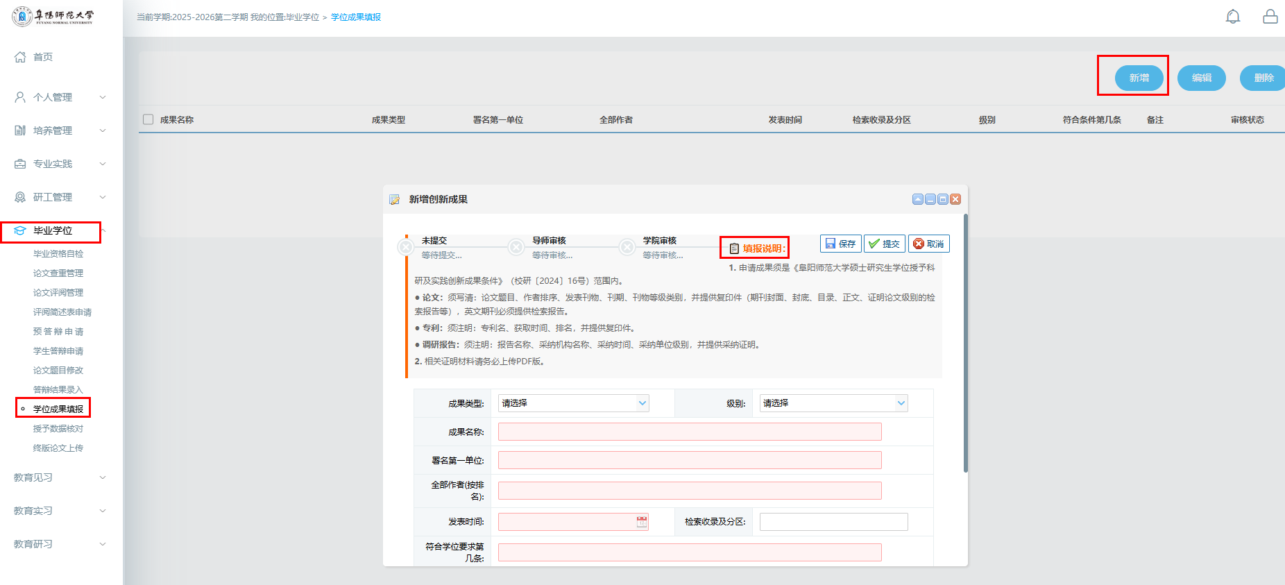 2.成果范围:研究生自入学之日起(2023年9月10日)至成果填报截止日前,获得的、符合《阜阳师范大学硕士研究生学位授予科研及实践创新成果条件》(校研〔2024〕16号)要求,且用于申请硕士学位的各类成果(超出该文件范围的成果无需填报)。