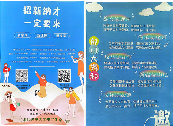 在面试活动前,校研究会在2023级新生报到时就已印制好招新宣传海报和宣传页在新生中进行广泛宣传,对新生同学介绍校研究生会的部门设置和工作职能,积极吸纳新生同学报名加入。同时,对面试活动环节的设计、面试题的准备、面试时间的确定等进行了精心组织,以“心”迎“新”,欢迎准时赴约、积极热情的准备加入校研究生会大家庭的2023级新伙伴们。