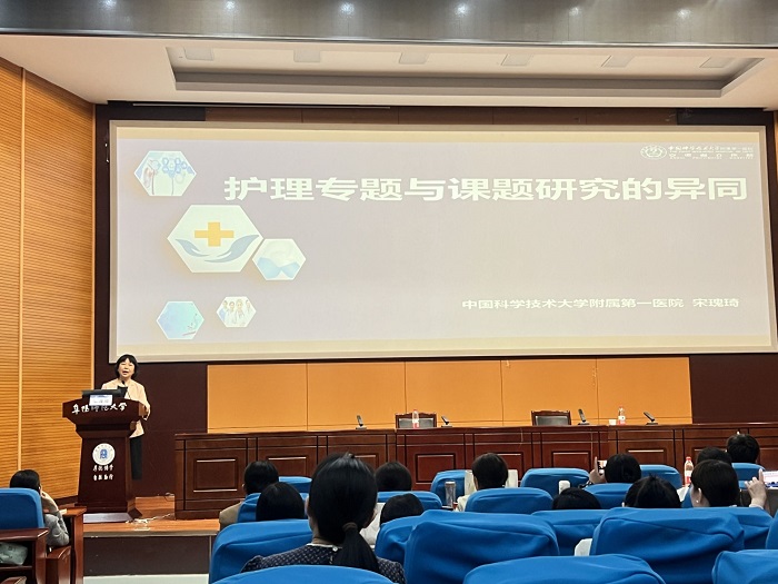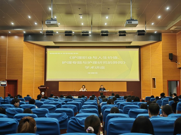 4月19日下午,中国科学技术大学附属第一医院教育处处长、中国科学技术大学临床医学院副院长、安徽省住院医师规范化培训事务管理处常务副主任、安徽省护理质量控制中心主任、安徽省护理学会副理事长宋瑰琦教授应邀来阜阳医学院开展学术讲座,在西湖校区躬行F楼报告厅作题为《护理职业与人生价值、护理专题与护理研究的异同》的学术讲座。阜阳医学院党总支书记石有武、院长刘玉祥、副院长陈德宇、医学院全体教师、护理专业学生及附属第一医院、附属第二医院、附属肿瘤医院、附属阜南医院、临泉县人民医院等单位护理部主任、护士长等200余人员与会。报告会由刘玉祥主持。