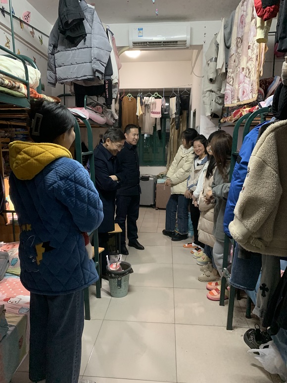 走访过程中,医学院领导和老师对学生宿舍的用电安全情况、宿舍卫生情况、疫情防控常态化下学生生活等方面进行了细致的了解,特别强调入冬以来同学们要严格遵守宿舍管理相关规定。刘玉祥对卫生良好、积极向上的宿舍同学表达了赞赏和鼓励,希望他们能够继续保持,发挥榜样的作用,与同学们分享学习生活所感;牛贵宏针对同学们的期末复习备考情况、日常作息安排,未来发展规划,提出宝贵意见,并叮嘱同学们在认真复习备考的同时要注重身体健康。此外,在当前疫情仍有反复、全国疫情形势紧张的大背景下,辅导员向同学们传达学校疫情防控最新安排,告知大家寒假应当减少外出,避免不必要的聚会等。在疫情防控的特殊阶段,医学院高度重视学生管理服务工作,倾听学生诉求,解答学生疑惑,对学生进行心理疏导,将防疫工作的开展压到最实处。