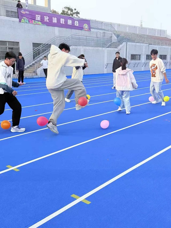 运动会设置的七大项目兼具趣味性与协作性:“七手八脚”项目要求4人组队按指令摆出指定肢体造型,考验快速反应与团队协作;“飞驰担架”项目中2人搭档抬担架竞速,紧张又刺激;“同心鼓”项目20人协作牵拉鼓绳,通过协同发力保持鼓面平稳,挑战颠球纪录,展现团队默契;“两人三足+人体器官拼图”项目将竞速与人体器官拼图结合,运动中融入医学知识;“球球大战”项目需4人团队保护己方气球并踩爆对手气球,场面热闹;“齐心协力跳绳”项目要求5人同步跳绳连续完成10次,考验团队耐力;“同舟共济过河”项目则由3人组队踩泡沫砖渡河,极具协作挑战性。