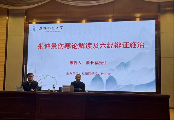 2026年4月8日,阜阳师范大学西湖校区二楼报告厅内墨香氤氲、古韵悠长,由阜阳医学院、校工会举办的“张仲景《伤寒论》解读及六经辨证施治”专题报告会在此举行。著名经方大家蔡长福先生携弟子团队倾情开讲,并通过现场义诊践行“中医生活化”理念,吸引全校200余名师生共赴这场穿越千年的中医文化之约。