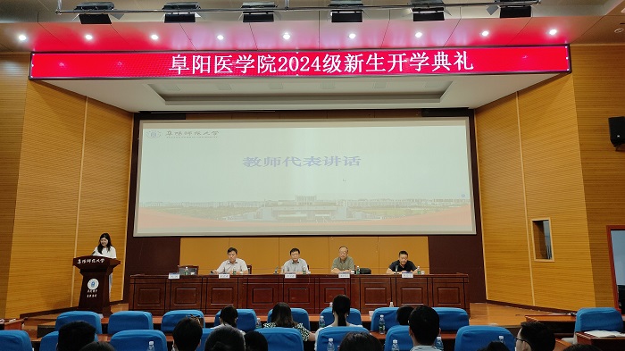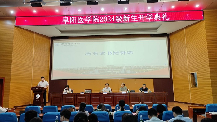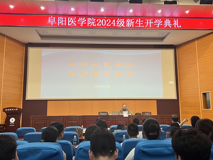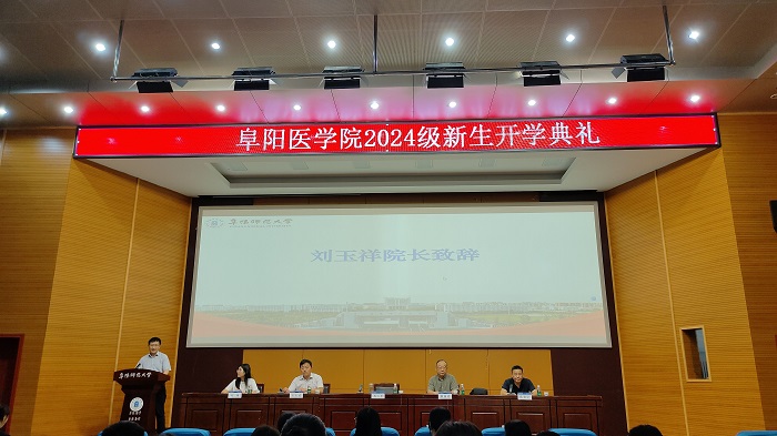2024年9月9日下午,阜阳医学院在躬行楼F楼报告厅举行2024年新生开学典礼暨入学教育,解放军电子工程学院原校长、博士生导师、邵国培少将,阜阳医学院院长刘玉祥、党总支书记石有武、学术副院长陈德宇、学院教职工代表以及全体2024级新生参加了典礼。典礼由陈德宇主持。