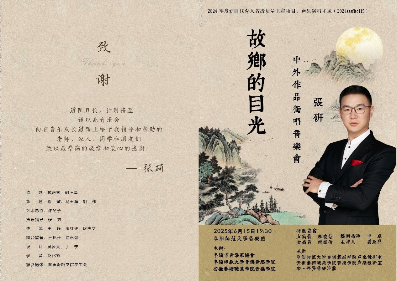6月15日,“故乡的目光”张研中外声乐作品独唱音乐会在音乐舞蹈学院音乐厅举办。音乐会由抒情男中音、安徽艺术职业学院音乐学院副教授张研领衔,特邀安徽艺术职业学院音乐学院副院长、副教授、一级演员、抒情女高音朱晓慧,阜阳师范大学音乐舞蹈学院青年教师、民族女高音席亚倩倾情助阵,安徽艺术职业学院音乐学院钢琴教师李卓担任艺术指导,阜阳市文化馆馆长刘亚非担任主持。