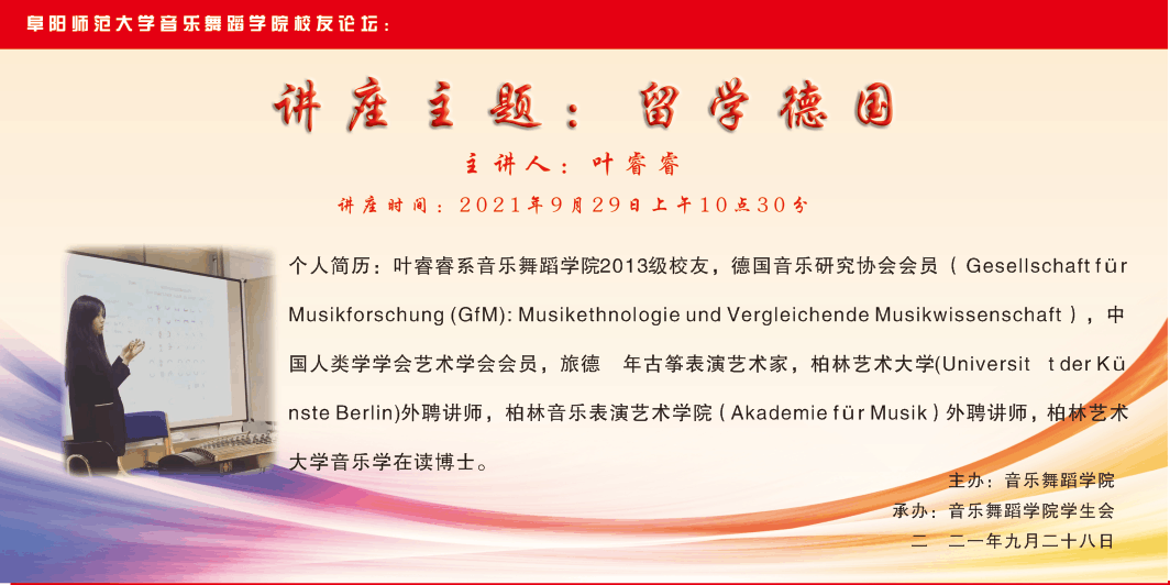 2021年9月29日上午,音乐舞蹈学院2013级校友、留德博士叶睿睿回到母校,以“留学德国”为题,为2021级新生同学现身说法,诠释成长之路。