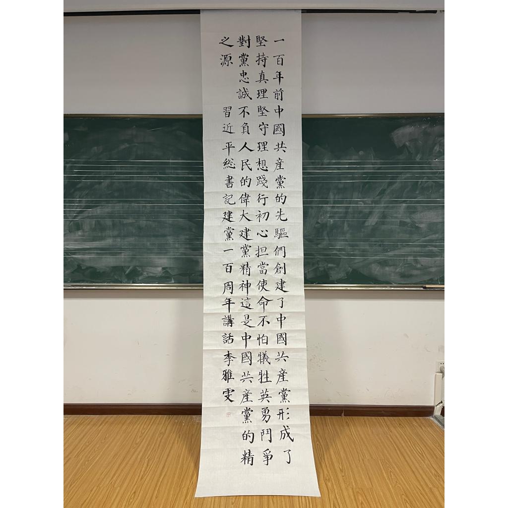 为进一步增强新时代青年的爱党爱国意识,讴歌党的伟大成就,弘扬光荣传统,鼓励青年人发愤图强,以书画艺术形式勾勒出百年风华盛世如愿的艰苦历程,增强文化自信心和民族自豪感,丰富大学生校园文化生活。我院于12月6日结束了长达两周“峥嵘百年史,砥砺中国行”书画长卷大赛。