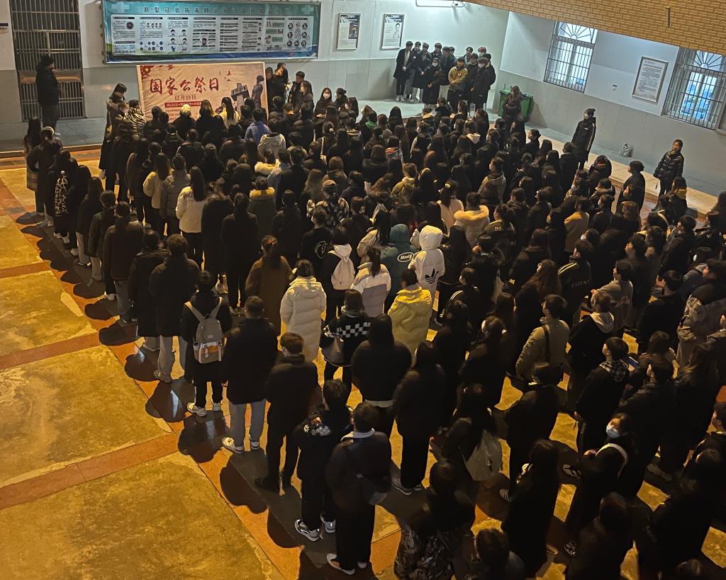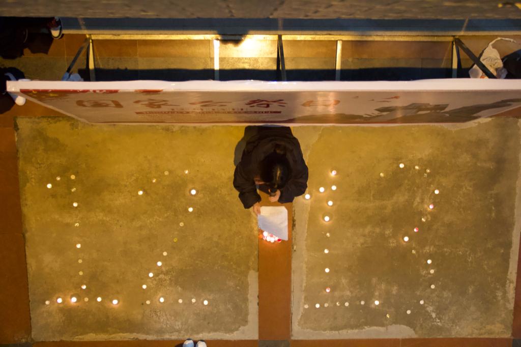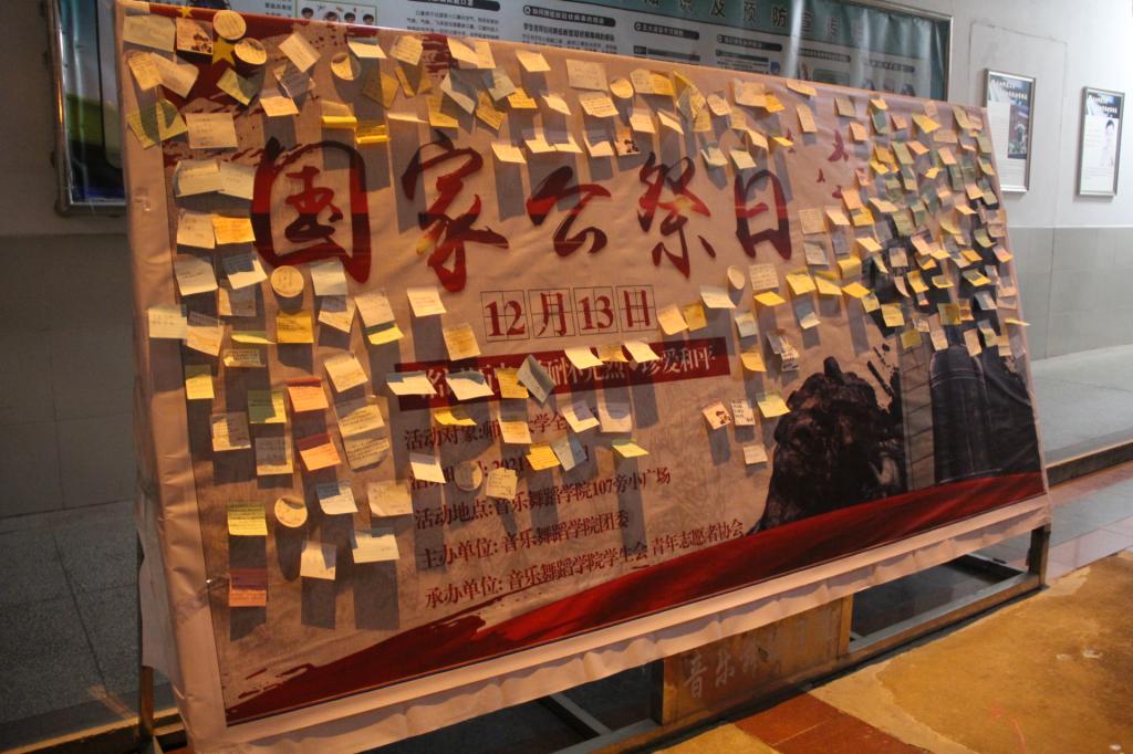 傍晚,各年级有序整队,同学们身着深色服装,神色凝重。活动开始,先由主持人宣读并介绍国家公祭日背景,随后,数名学生点燃呈现出国家公祭日日期的蜡烛。伴随着烛光,集体宣誓默哀,祭奠那30万遇难同胞和那永远无法抹去的伤痛。默哀结束,全体成员齐奏国歌。庄严嘹亮的歌声回荡整栋韶华楼,仿佛在告慰着先烈们,如今的中国、如今的少年已经强大起来,再也不怕被欺负。活动进行到尾声,同学们将提前准备好的,想对先烈们表达的内容写在便利贴并粘在了海报上,此次公祭日纪念活动就此宣布圆满结束。