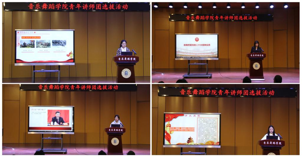为深刻领会党的二十大的重大意义,迅速兴起学习宣传贯彻党的二十大精神的热潮。3月10日,音乐舞蹈学院举办青年讲师团选拔活动,学院党总支副书记马玉海、团委负责人薛程文、19级学生戴诗怡担任此次选拔活动评委。经过班级初选,共8位选手进入院级选拔。