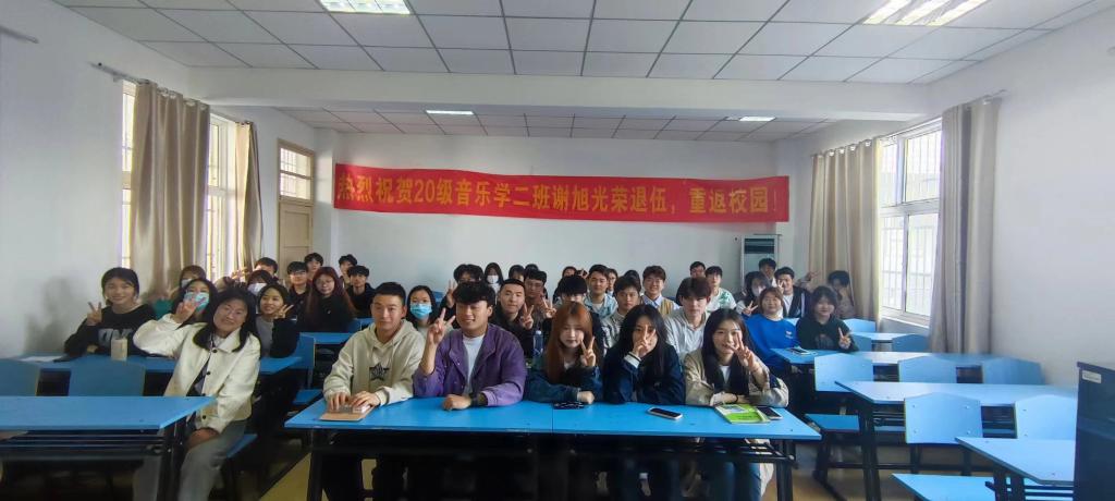 2022级音乐学2班全体同学用最热烈的掌声对班级的新成员表示欢迎。谢旭同学表示,两年的军旅生活带给了他不一样的阅历与信心,复学后会更加坚定自己的理想信念,努力学习,与同学们和睦相处,共同进步。