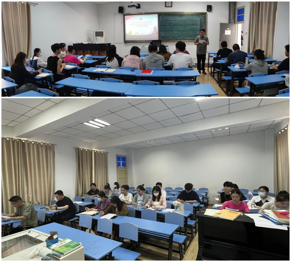 5月24日、31日,音乐舞蹈学院学生党支部分别在韶华楼203会议室、305教室举行学习贯彻习近平新时代中国特色社会主义思想主题教育“三问”交流研讨暨读书分享会。学院党总支副书记马玉海、学生党支部书记胡玉然、支部委员余海涛、薛程文、孙丹丹参加交流研讨和读书分享。学生党支部全体师生党员参会,其中,毕业班学生党员线上参加会议,会议由胡玉然主持。