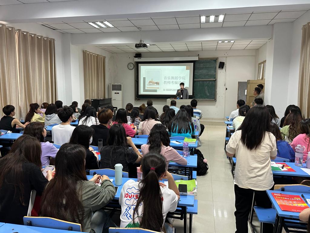 6月7日下午,音乐舞蹈学院在韶华楼107教室举行教师考编政策解读和经验交流会。政策解读由金太阳教育政策解读讲师阳光主讲,经验交流由音乐舞蹈学院2019级学生徐涛主讲。音乐舞蹈学院党总支副书记马玉海、学生辅导员余海涛、团总支负责人薛程文以及百余名学生参加会议,会议由余海涛主持。