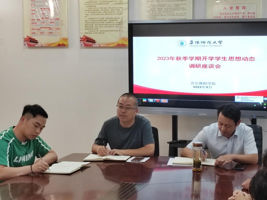 新学期伊始,为及时把握学生暑期返校后的思想动态,更好地为学生的学习生活营造良好氛围。9月6日,音乐舞蹈学院在韶华楼203召开秋季学期开学学生思想动态调研座谈会,音乐舞蹈学院党总支书记刘克思、党总支副书记马玉海、团委负责人薛程文及各年级学生代表参会。会议由薛程文主持。