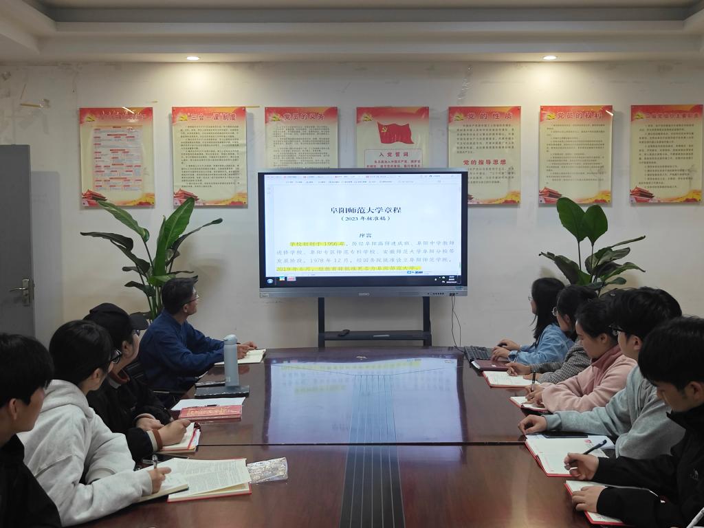 会上,孙丹丹带领大家共同学习了《阜阳师范大学章程》(2023年核准稿),并对重要内容进行了标注和解读。其中,学到关键内容时进行再三强调,并对相关重要内容进行提问,不断加深党员同志们对学校的认识。