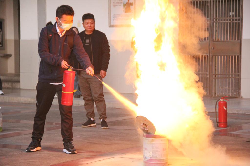 灭火演练活动中,朱佳亮现场进行灭火演示,就如何使用灭火器等业务技能进行实地操作和示范讲解。参加演练的师生认真观看了演示并踊跃参加了灭火实践操作。