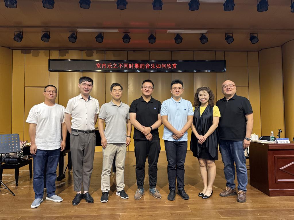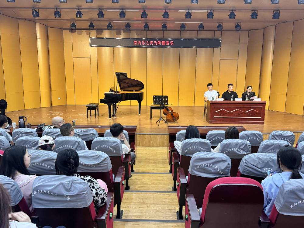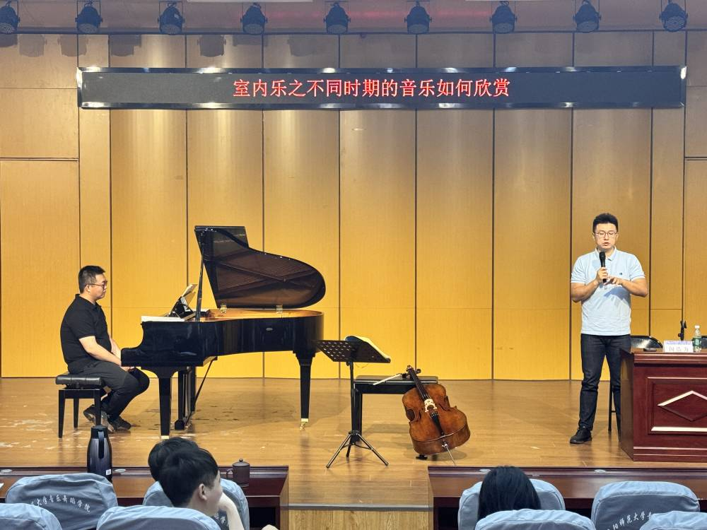 5月23日,音乐舞蹈学院邀请浩洋室内乐团的刘震洋、闵浩为两位演奏家来我院开展了“室内乐之何为听懂音乐”、“室内乐之不同时期的音乐如何欣赏” 两场音乐讲座活动。 讲座由副院长程敏主持,2021级音乐学、音乐表演专业本科生、2023级硕士研究生以及器乐、钢琴和理论教研室部分教师参与了此次活动。