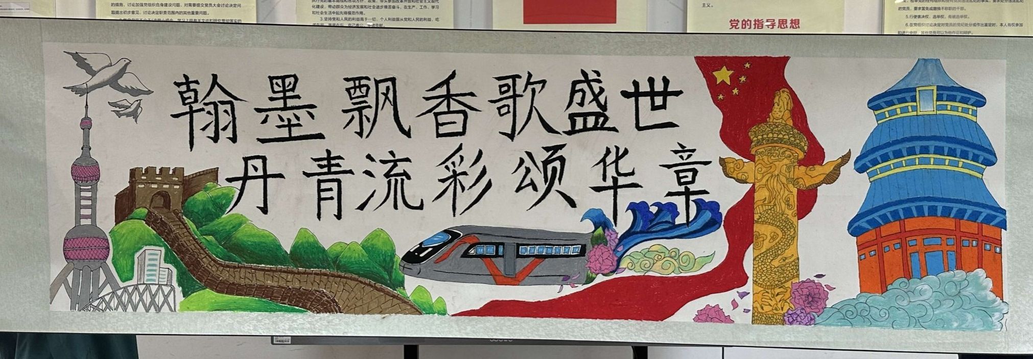 在长长的画卷前,大家纷纷拿起画笔、蘸饱墨汁。绘画者精心勾勒线条、涂抹色彩,用细腻笔触展现盛世繁荣,无论是绚丽的花朵、雄伟的建筑还是人们幸福的笑脸,都跃然纸上;书法创作者则笔走龙蛇,运笔间尽显功力,或大气磅礴的行书、或端庄严谨的楷书,书写出对伟大时代的歌颂之词。