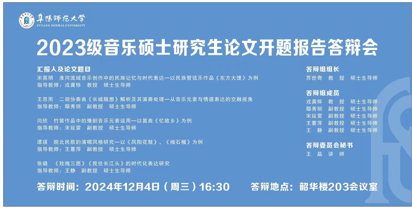 为提高研究生培养质量,促进研究生创新能力,切实做好研究生学位论文指导工作,12月4日,音乐舞蹈学院在韶华楼203会议室举行2023级音乐硕士研究生学位论文开题报告答辩会。评审专家由安徽师范大学音乐舞蹈学院院长汪海元教授和院内专家组成,5位2023级硕士研究生做开题报告答辩,2024级10位研究生到场学习。