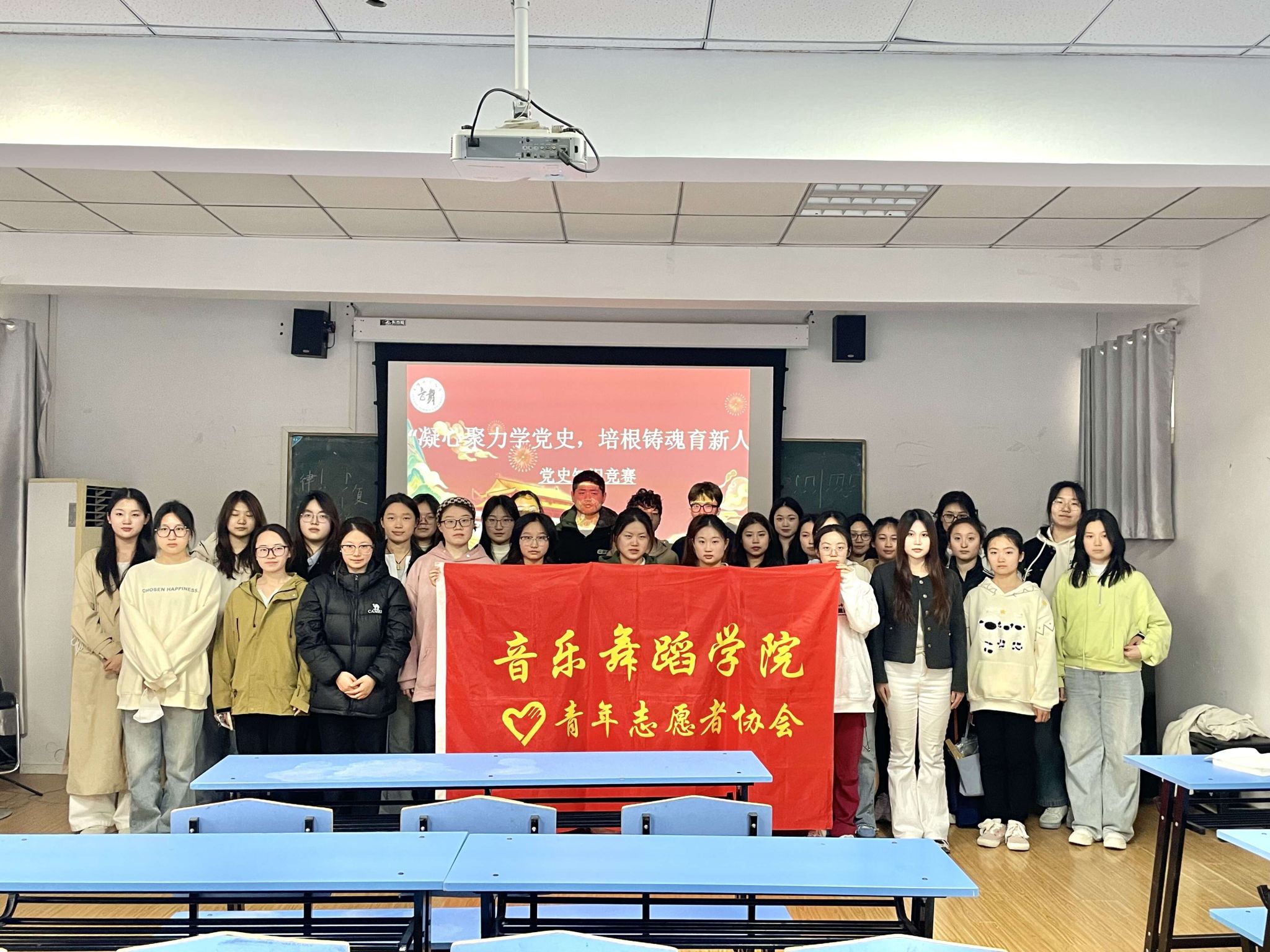 为深入推进党史学习教育常态化,教育引导广大青年学生坚定理想信念,传承红色基因,增强民族自豪感和爱国情怀,音乐舞蹈学院于4月2日在艺术楼302教室举行了一场以“凝心聚力学党史,培根铸魂育新人”为主题的党史党章知识竞赛院级选拔赛。