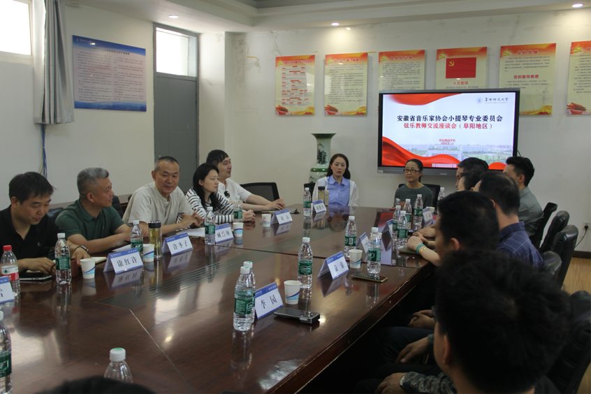 5月19日下午,安徽省音乐家协会小提琴专业会议在韶华楼203会议室隆重举行。安徽省音乐家协会副主任邵尉、省音协小提琴专委会会长王晓洁、安徽乐团大提琴首席李园、安徽师范大学教授、小提琴硕士研究生导师袁泉、音乐舞蹈学院党委书记臧岳林,阜阳市音乐家协主席许冬子,阜阳市音乐家协会副主席康红许,阜阳市音协副秘书长于雪,音乐舞蹈学院青年教师胡馨天、周沫等人出席会议。本次会议由李璐主持,安徽省音乐家协会会长许冬子致开幕词,来自省内音乐领域的专家学者齐聚一堂,共商安徽省小提琴艺术发展大计。