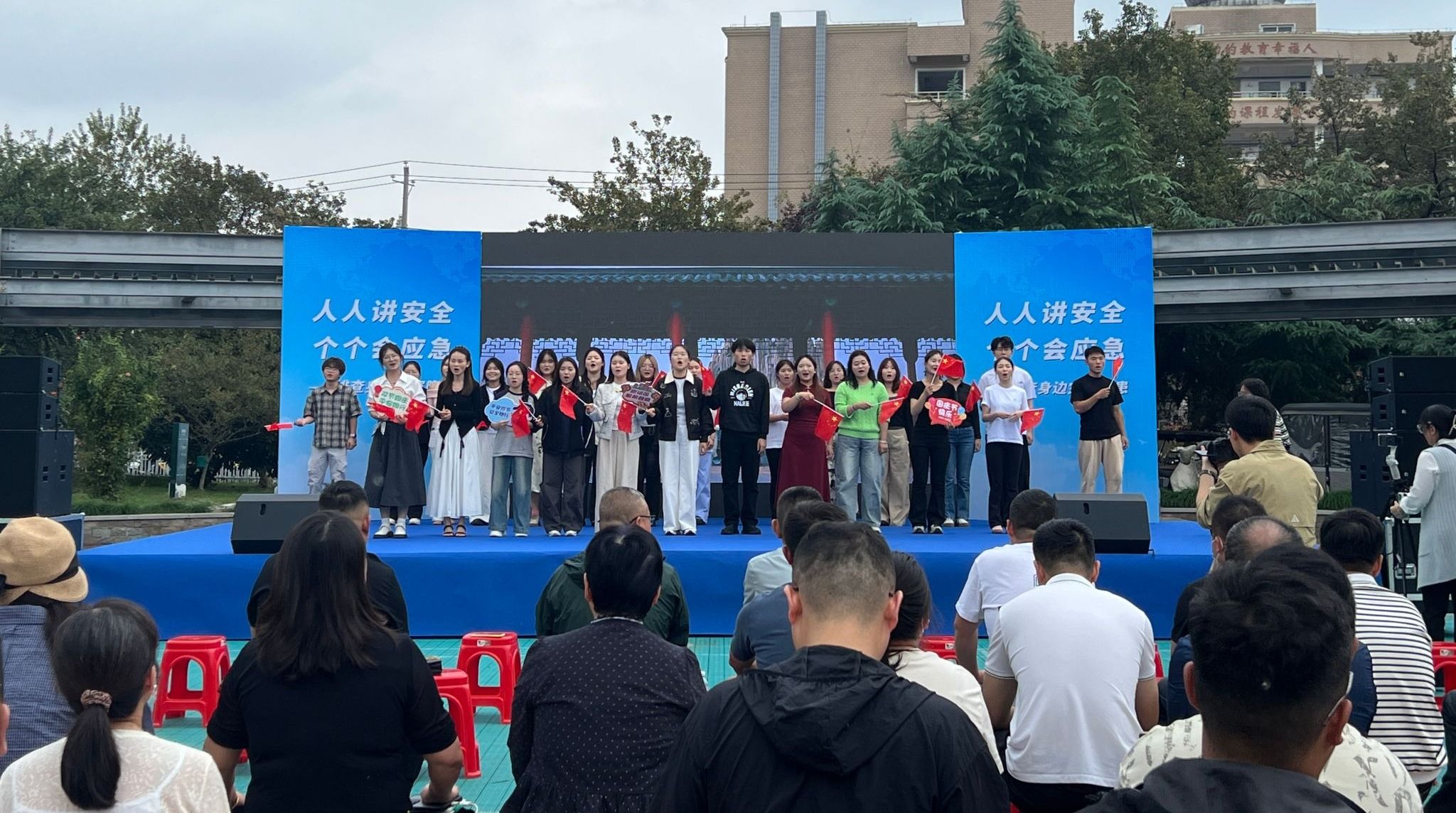 除了做好志愿服务工作,音乐舞蹈学院学子还带来了精彩的歌唱表演。《我和我的祖国》的旋律响起,激昂又深情的歌声,抒发着对祖国的热爱与祝福,瞬间点燃现场氛围,也让大家在双节将至的时刻,更添对祖国的深情眷恋。《生命的盾牌》歌声铿锵有力,传递出对安全的坚守与捍卫,契合活动提升安全意识的主题,让安全理念更深入人心。《祝你平安》的演唱则满含温情,一句句“祝你平安”,既是对现场群众的美好祝愿,也寄托了希望大家都能平安度过双节的期许。