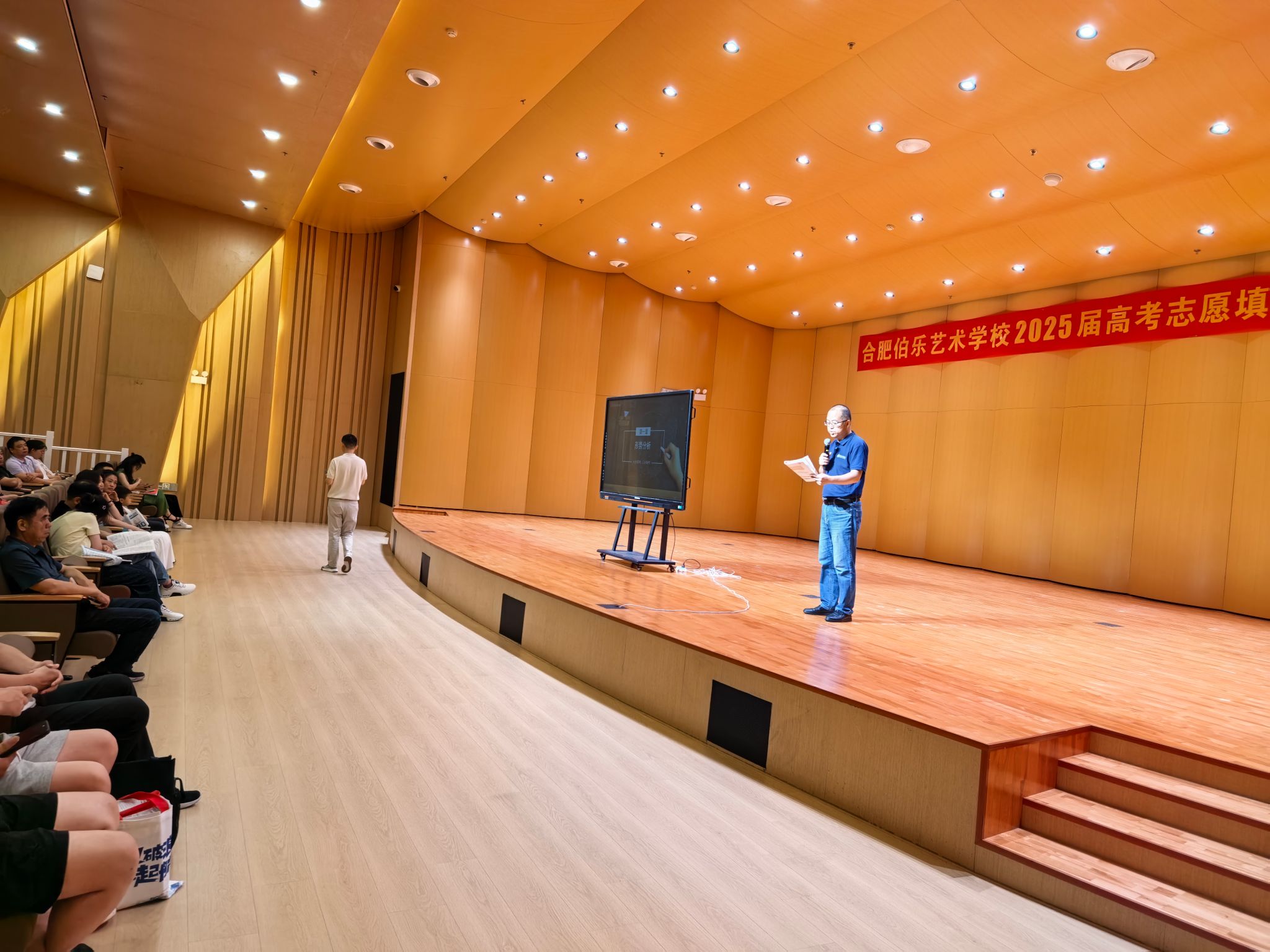 在合肥伯乐艺术学校,招生组成员学院党委副书记马玉海开展招生宣讲活动。讲座现场互动频繁,同学们积极提问,对大学生活和专业学习充满了向往。