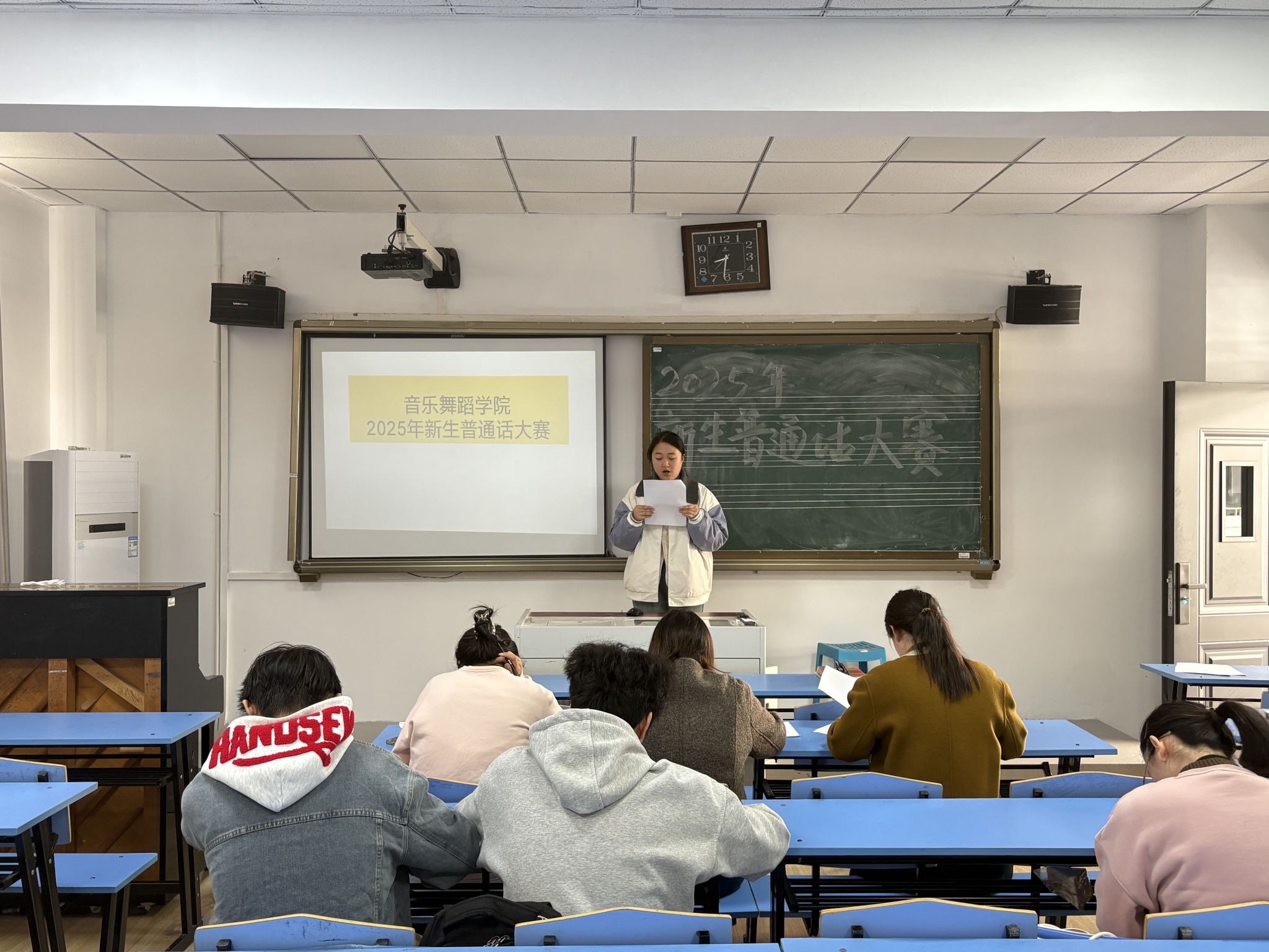 为推广普及国家通用语言文字,提升新生语言表达能力与综合素养,并为其提供一个展示才华、交流学习的舞台,音乐舞蹈学院于10月24日在韶华楼304教室隆重举行了2025级“雅言传承经典,艺术点亮新声”新生普通话大赛。学院团委负责人孙丹丹、辅导员楚彬杰、胡玉然担任此次比赛评委。