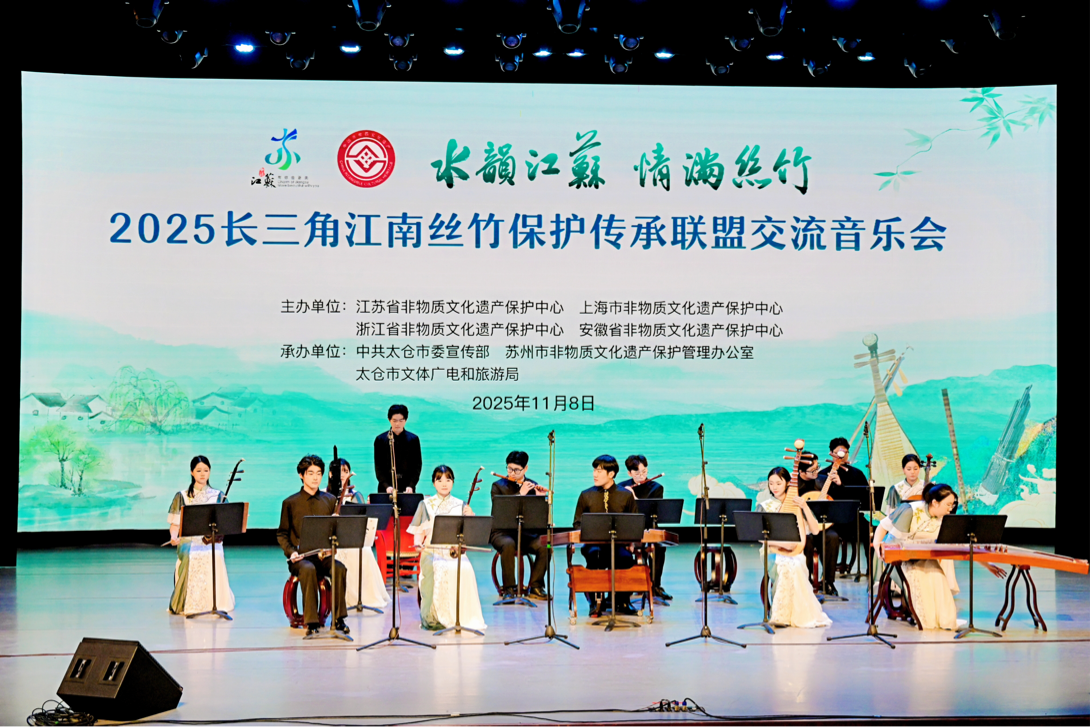 11月7日至8日,“水韵江苏·情暖丝竹”2025长三角江南丝竹保护传承联盟交流展演在江南丝竹发源地江苏太仓隆重举办。活动由江、浙、沪、皖四地非物质文化遗产保护中心联合主办,中共太仓市委宣传部、苏州市非物质文化遗产保护管理办公室、太仓市文体广电和旅游局共同承办,以“比赛+座谈+音乐会+非遗市集”的多元形态,搭建起区域非遗协同发展的交流平台,让江南丝竹这一国家级非遗的传统底蕴与时代活力交相辉映。
