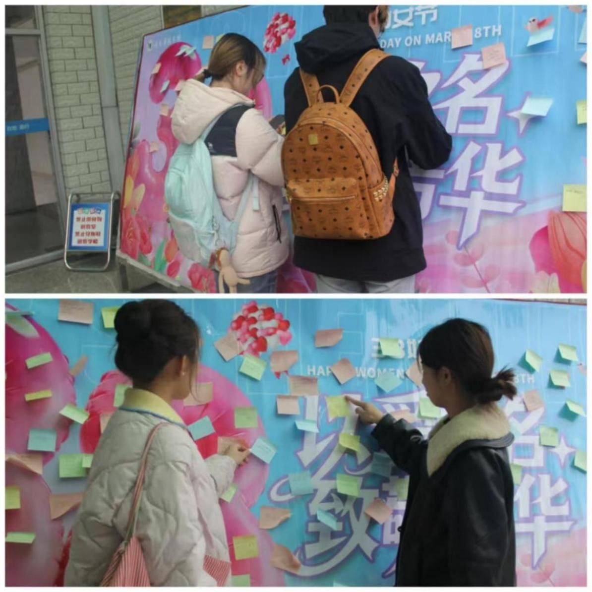 手串制作完成后,同学们纷纷移步至留言板前,执笔书写,将对自己的成长期许、对身边女性的节日赞美与美好祝福诉诸笔端,一字一句皆温情,一言一行皆暖意,让现场洋溢着温馨和谐的氛围。