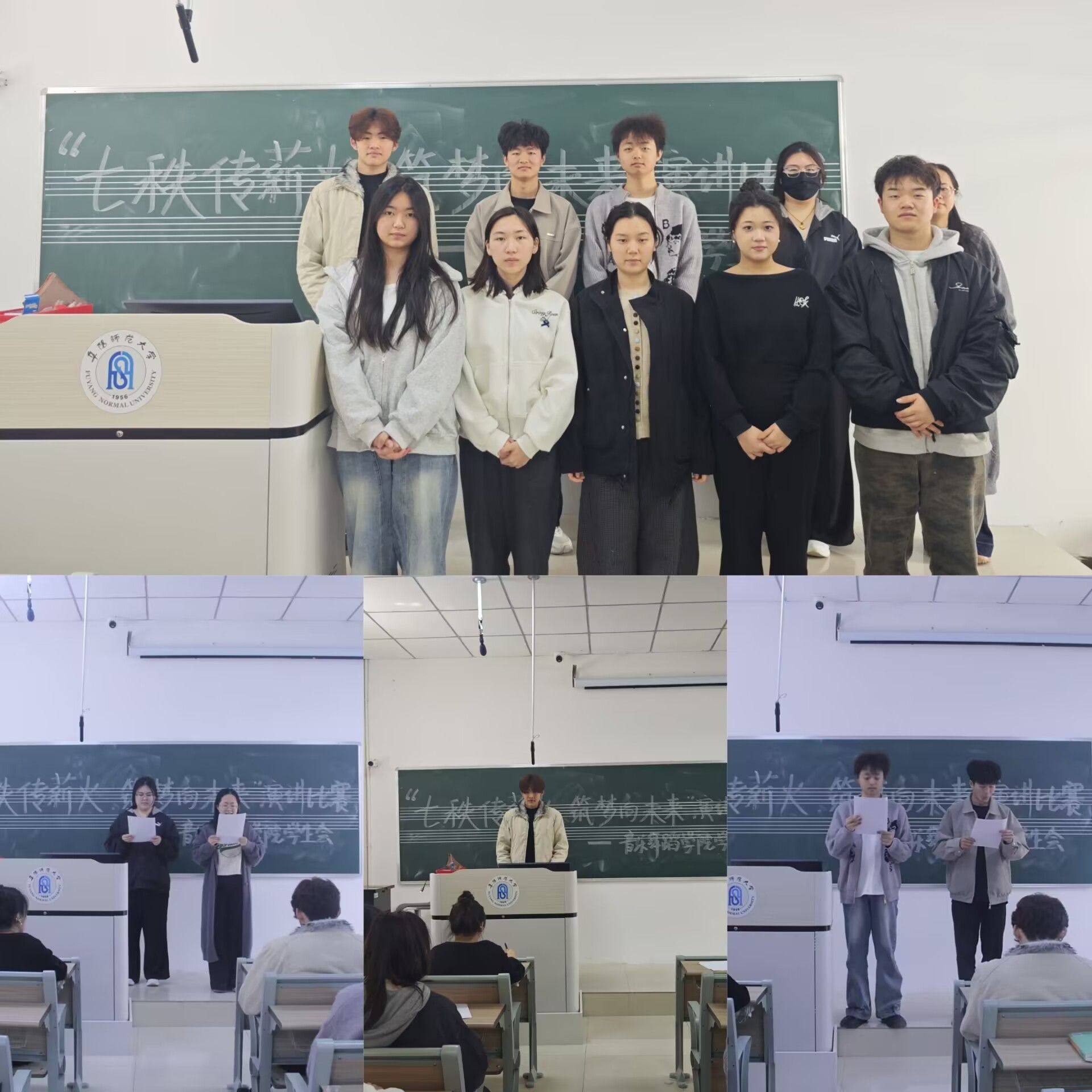 2026年,阜阳师范大学迎来建校70周年。七十年栉风沐雨、薪火相传,七十年弦歌不辍、砥砺前行。为挖掘校史感人故事,展现师大人坚守教育初心、勇担时代使命的精神风貌,激发青年学子爱校荣校情怀,凝聚奋进力量,4月24日,音乐舞蹈学院在107教室举办“七秩传薪火,筑梦向未来”主题演讲比赛,院团委负责人孙丹丹、辅导员胡玉然、学生会主席郭雨佳、王淑娴担任评委。