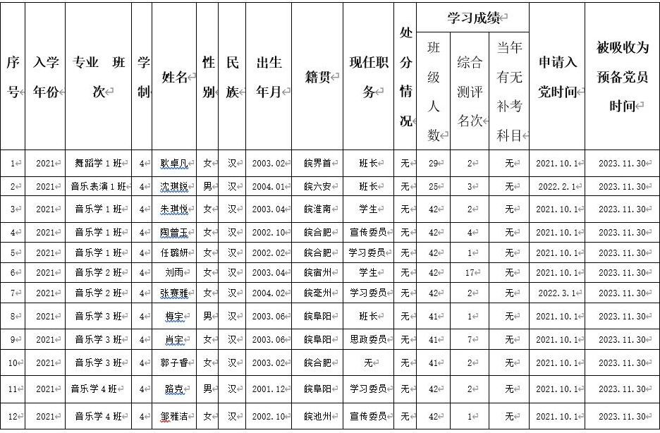耿卓凡等12名同志的预备期将满,根据本人申请,在听取党员、群众意见的基础上,经支部委员会同意,拟于近期召开党员大会讨论其转正问题。为了进一步增强发展党员工作的透明度,严格发展党员工作程序,根据《中共阜阳师范大学委员会发展党员工作实施细则》等文件的有关精神,现将讨论转正问题的人员情况公示如下。