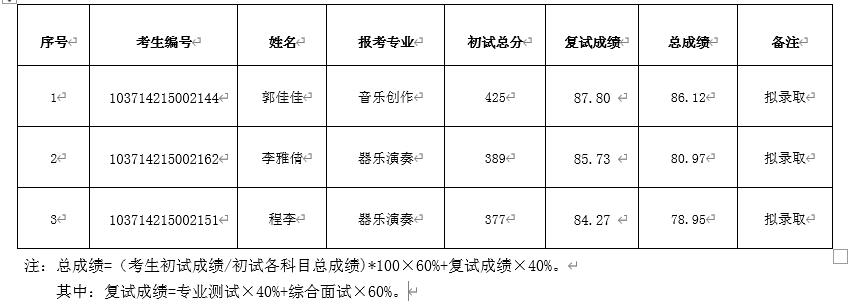 公示时间为3月30日至4月12日。若有异议,请在公示期间实名向音乐舞蹈学院硕士研究生招生复试工作考核领导组反映。确定为拟录取的考生,若有放弃拟录取资格者,将按照参加复试考生总成绩排序依次递补,正式录取名单以上级招生考试部门审定的为准。