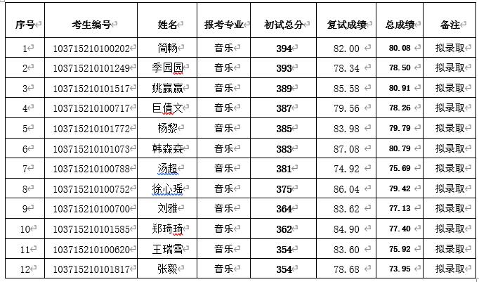 根据教育部《关于印发<2025 年全国硕士研究生招生工作管理规定>的通知》(教学〔2024〕4号)、《关于做好2025年全国硕士研究生复试录取工作的通知》(教学司〔2025〕4号)、《关于进一步规范全国硕士研究生招生调剂工作的通知》(教学司〔2025〕5号)和安徽省高等学校招生委员会 安徽省教育厅《关于做好安徽省2025年硕士研究生复试录取工作的通知》(皖招委〔2025〕2号)等相关文件要求,按照阜阳师范大学音乐舞蹈学院2025年硕士研究生复试录取工作方案。现将我院2025年音乐学科/专业第一志愿全日制硕士研究生拟录取名单公示如下: