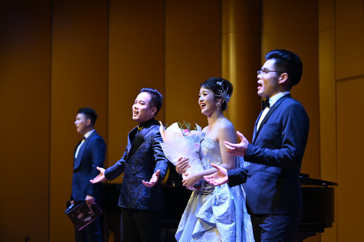 旅美女中音、声乐表演博士、我院青年教师季一言担任主角,特邀中国音乐学院钢琴艺术指导、教研室主任张笑老师,携学院青年教师徐永强、王泽平等嘉宾共同登台。演出中,《怀念曲》《江城子·乙卯正月二十日夜记梦》等中国经典作品,以字正腔圆的演绎传递深沉文化意蕴;《向她倾吐我的爱情》等外国歌剧选段,用饱满情感展现多元艺术风情。尤其纪念中国人民抗日战争暨世界反法西斯战争胜利80周年的原创作品《此心毅然》,由我院教师康红许和阜阳市音乐家协会主席许冬子共同创作,以激昂旋律与炽烈情感诠释先辈赤诚,成为全场最震撼的高潮;终曲《我和我的祖国》引发集体合唱,让家国情怀在乐声中深深扎根。