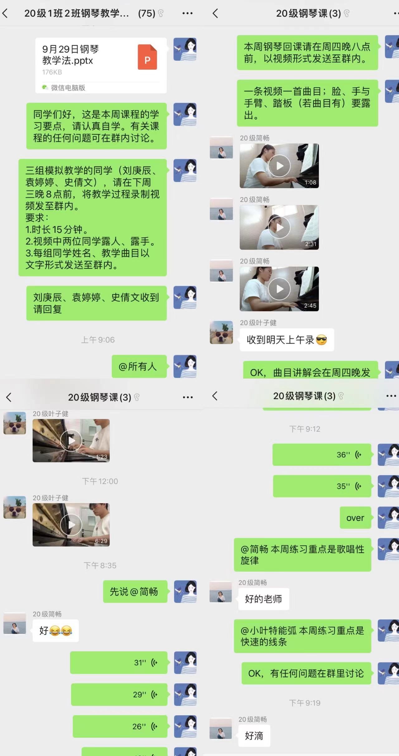 钢琴教师们集思广益,互相借鉴,选取了腾讯会议直播、腾讯课堂直播、QQ视频、QQ群、微信群、微信视频、钉钉课程等多平台进行教学,确保线上教学的顺利进行。在保证教学的基础上,及时上交自己的线上教学情况供学校了解、监督。