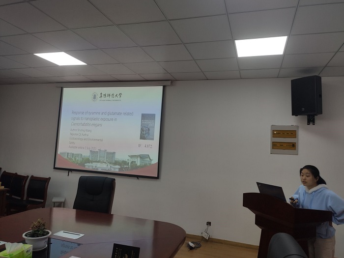 齐学慧同学汇报的是《Response of tyramine and glutamate related signals to nanoplastic exposure in Caenorhabditis elegans》这一文献研究了秀丽隐杆线虫酪胺酸和谷氨酸相关信号对纳米塑料暴露的反应。通过研究发现,TYRA-2被鉴定为神经元中酪氨酸的相应受体,并在控制纳米塑性毒性期间,GLR-4和 GLR-8进一步被鉴定为神经元中谷氨酸的相应受体。此外,研究还发现这三种受体分别作用于 ERK MAPK/MPK-1信号、 JNK MAPK/JNK-1信号和 DBL-1/tgf-β 信号的上游,调节纳米细胞的毒性作用。实验的研究结果强调了酪胺和谷氨酸相关信号在控制生物体对纳米颗粒暴露的反应中的重要功能。
