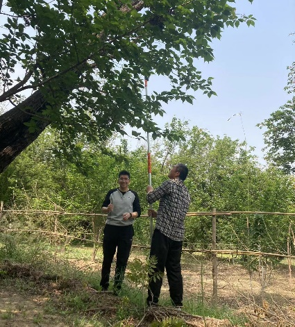 本次调研主要为鉴别湿地公园中的樱桃果树品种,以挑选优良的樱桃品种。在湿地管理人员王国枢研究员的带领下,对园内40棵之前标记的樱桃树的果实形态和颜色进行了统计与观察,并用游标卡尺测量了果实纵、横径和果柄长度等指标。中心一行人员随后采集了青油椿、黑油椿和红油椿嫩芽和不同年份的香椿树皮,以便进行实验室检测与功能分析。此行不仅提高了研究生们的行动和观察能力,而且增长了见识。他们认识到既要“读万卷书”,也要“行万里路”,在实践中提升实力,实现个人成长。