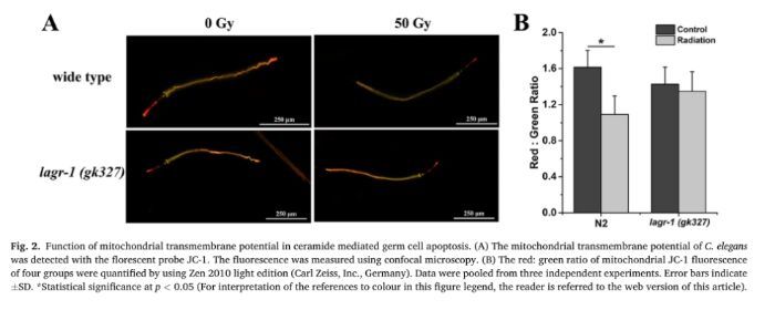 研究人员通过进行以下线粒体膜电位测定,检测活性氧类物质水平,RNA干扰测定,实时定量PCR的实验,得出辐射诱导对生殖细胞凋亡的作用。许多研究表明,线粒体在凋亡过程中依赖于抗凋亡(Bcl2)和凋亡蛋白的调节以及线粒体外膜的通透性来释放促凋亡因子如细胞凋亡因子 ,神经酰胺与线粒体在细胞凋亡中的功能密切相关。例如,x 射线引起的双链断裂(DSB)可以诱导 神经酰胺介导的线粒体神经酰胺合成,并引起细胞凋亡神经酰胺可在线粒体外膜上形成通道并释放促凋亡因子以激活下游凋亡因子。在 HepG2人肝癌细胞中,神经酰胺依赖性凋亡与线粒体呼吸功能、细胞因子 c 释放和 caspase-3活性有关。结果表明,IR 可诱导 MTP 的降低,RNAi 降至 lagr-1可抑制 MTP 的降低,提示神经酰胺可调节生殖细胞凋亡中 MTP 的变化,从而在线粒体中发挥作用。(撰稿:刘家惠)